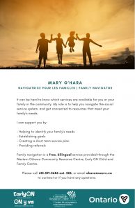 It can be hard to know which services are available for you or your family in the community. As a family navigator, my role is to help you navigate the social service system, and get connected to resources that meet your family’s needs. I can support your family by: helping to identify your family’s needs, establishing goals, creating a short term service plan, and providing referrals. Family navigation is a free, bilingual service, serving children and families in the West end of Ottawa.