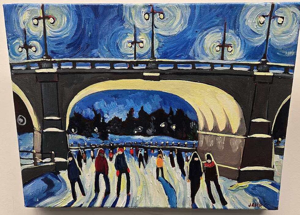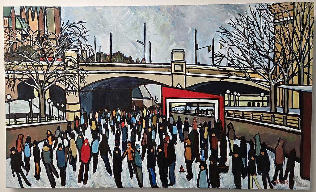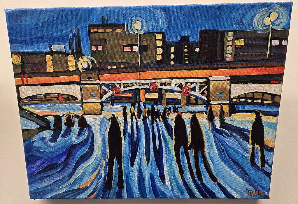 Her recent display at the Stittsville Public Library captures the winter canal scenes beautifully with her big and bold artwork.